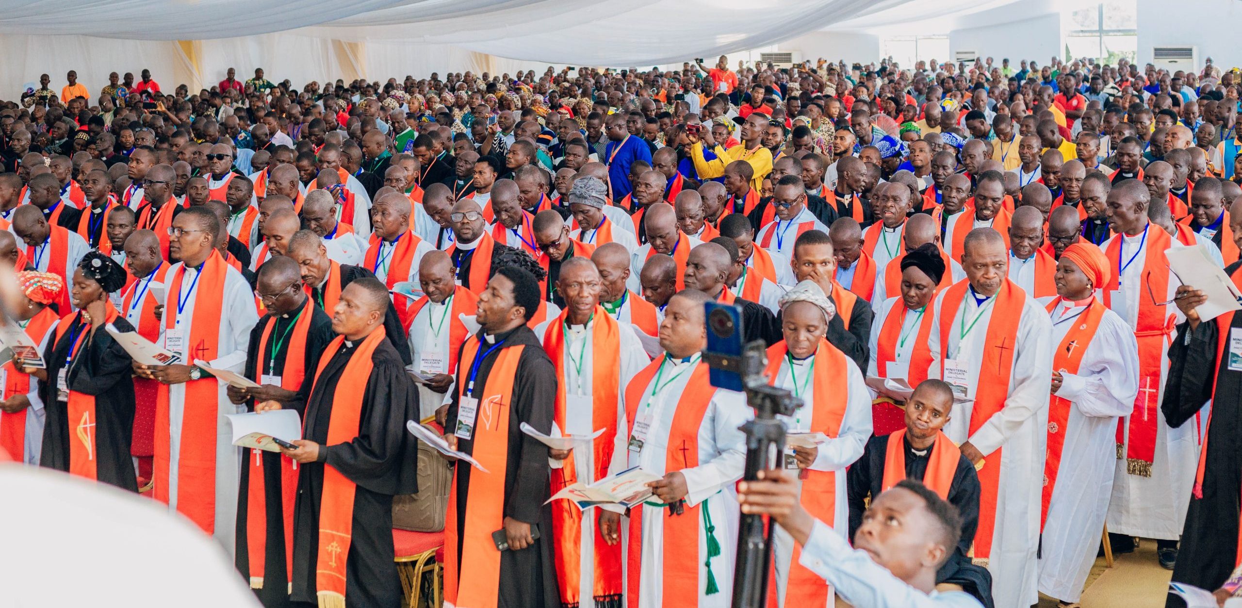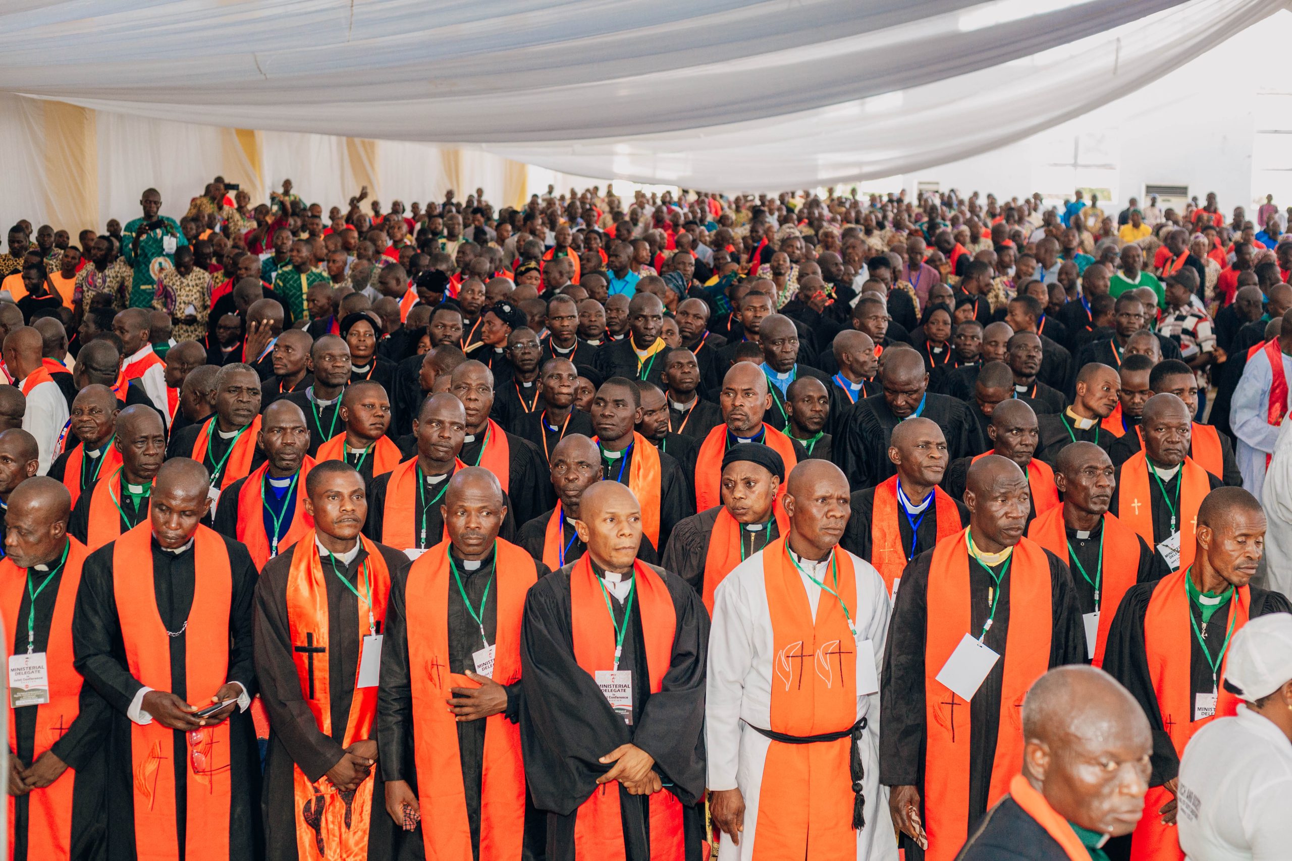 The clergy of the Five Annual Conferences in a solemn and joyful session of praise at the 2025 Joint Conference.